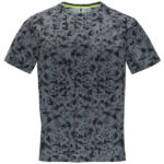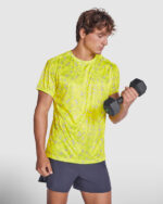 Camiseta técnica de manga corta estampada. Cuello redondo con cubre costuras de refuerzo a contraste en color amarillo flúor. Paneles laterales en interior de manga y en los hombros con remallado a tono. Tecido suave, ligero y transpirable, fácil secado.