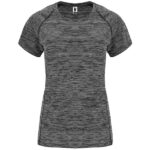 Camiseta técnica entallada de mujer en tejido poliéster de manga corta estilo ranglán. Cuello redondo. Camiseta de tejido con caída confortable y fácilmente adaptable al cuerpo.