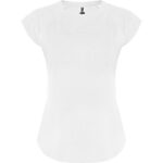Camiseta técnica multi-deporte de mujer manga corta estilo manga ranglan. Cuello pico. Tejido poliéster con tacto algodón. Corte entallado.