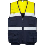 High Visibility Multibolsos vest. · Two reflective tapes on chest., With metal ring. Two pockets in chest with bellows, VELCRO PACK AND CLOSURE. · Two side pockets with bellows and zip closure with two superimposed pockets with a lag and velcro closure. · Two rear tapes at waist and back. · Two pockets in the rear with a rug and velcro..