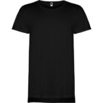 Camiseta de manga corta y talle extra largo, con cuello redondo de dos capas con elastano. Aberturas laterais no baixo. O patrón traseiro é lixeiramente máis longo que o dianteiro.