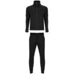 Chándal combinado de chaqueta y pantalón:·Cuello alto con cubrecosturas interior a tono.·Cremallera central a tono con tirador. ·Bolsillos laterales de chaqueta con cremalleras.·Banda lateral a contraste. ·Pantalón con cintura elástica y cordón ajustable.·Dos bolsillos laterales.·Bolsillo trasero con cremallera.·Bajo con puños elásticos en canalé 1×1.