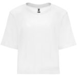 Camiseta de talle corto y holgado para mujer con manga corta. Cuello redondo con ribete ancho en canalé 1×1. Cablecture sintonia indartua.