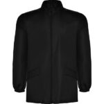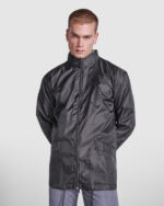 Chubasquero unisex.· Cuello alto y capucha extraíble con cordones ajustables.· Cremallera central al tono con tirador.· Dos bolsillos laterales con solapa.· Puños elásticos.· Bajo con cordones ajustables en interior.· Goma elástica en el interior del bolsillo para su plegado y guardado.