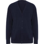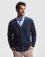 Chaqueta con escote de pico para hombre.· Tejido en punto suave. · Cierre central de cinco botones al tono. · Dos bolsillos de plastón. · Puños y cintura elásticos en punto canalé.