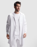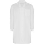Bata de manga larga unisex. · Abertura central con Botones automáticos en el interior. · Bolsillo interior en pecho izquierdo.· Puños ajustables de canalé 1×1.