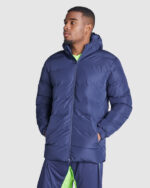 Parka acolchada. Capucha fija con visera. Cremallera frontal a tono con doble tirador y protector de barbilla. Puños elásticos. Dos bolsillos laterales con cremallera. Acceso interior para marcaje.