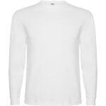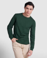 Camiseta de manga larga, tejido tubular, con cuello redondo de 4 capas y puños canalé 1×1. Cubrecosturas reforzado en cuello y hombros.