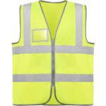Chaleco de alta visibilidad con cremallera. · Dos cintas reflectantes horizontales en el pecho y verticales en los hombros· Bolsillo transparente en pecho derecho para identificación.