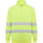 Sudadera de alta visibilidad con media cremallera.· Cuello alto con protector de barbilla y tirador.· Cubrecosturas reforzado en el interior del cuello. · Dos cintas reflectantes horizontales en torso y mangas.· Punto canalé 1×1 en puños y bajo.