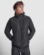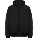 Chaqueta acolchada repelente al agua.·Capucha extraíble con ajustadores. ·Cuello alto. ·Cremallera central a tono con protector de barbilla. ·Dos bolsillos laterales con cremallera. ·Punto canalé 2×1 en puños y cintura. ·Acceso para personalización en pecho izquierdo y espalda.