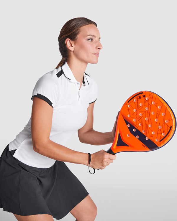 Polo técnico das mulleres encaixado curto no poliéster de reciclaxe antibacteriana. Pescozo e borde de manga detallada en Canalé 1×1. Cabrecturas reforzadas no pescozo. Tapesta con 2 Botóns automáticos. Pezas de ombreiro e detalles de contraste. Aberturas laterais no baixo.